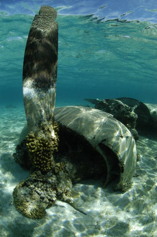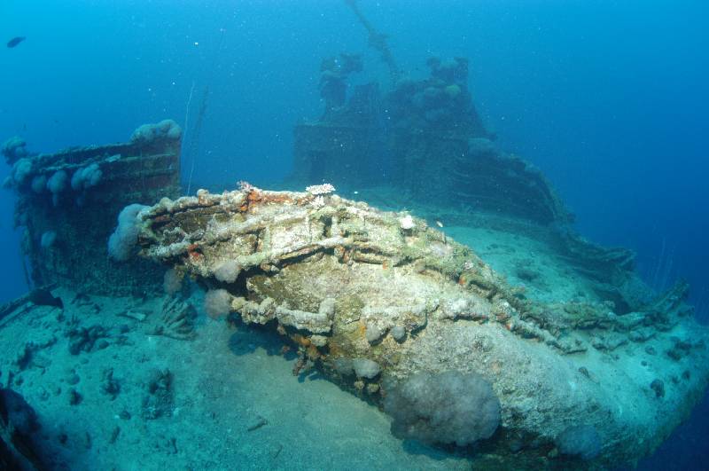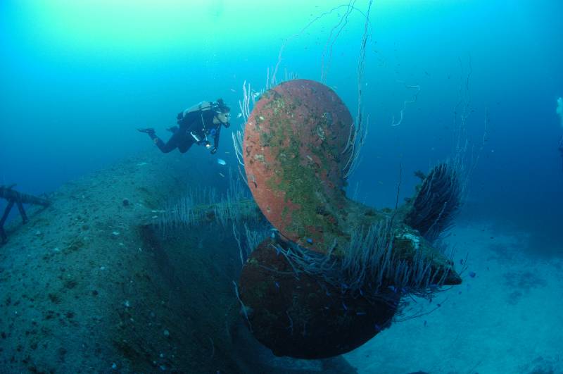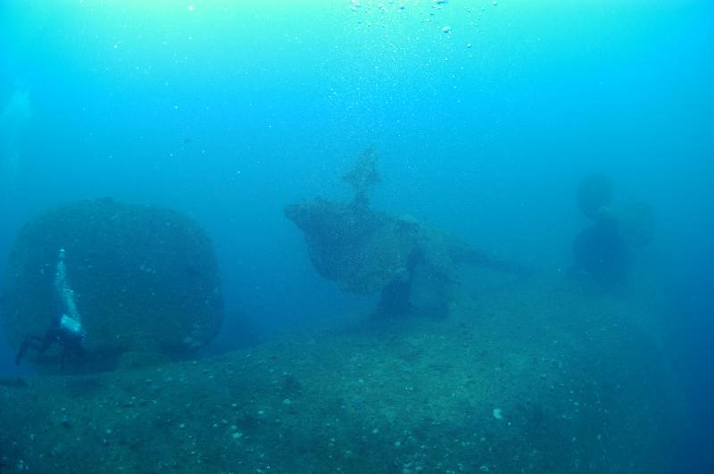 Five of our 12 dives were on the USS Saratoga and included penetration of the hanger deck complete with Avengers, a penetration called the "haunted house" between decks through torpedo and bomb rooms. Another down to the stern to view the massive propellers, and finally for me, one of the best, the bow. Imagine sitting on the sand looking up at the bow and flight deck of an aircraft carrier!!!