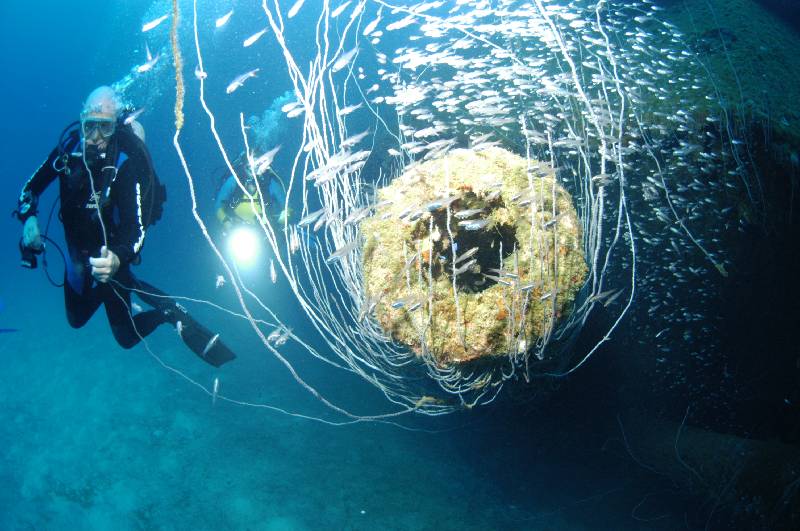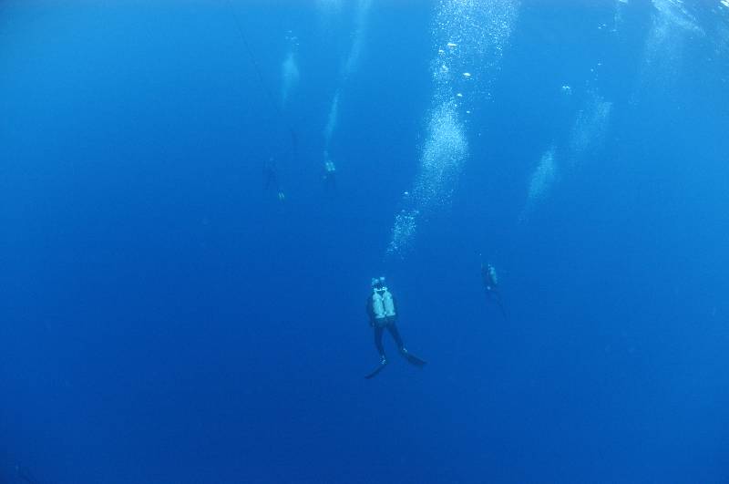 The trapeze has bars set at 9mts, 6mts and 3mts, the swim from Sara to the trapeze is done at 12mts. Hanging from the trapeze are 2 first stage regulators both with 7 second stages connected to each on long hoses. These regulators supply 75% nitrox from cylinders on the boat for your decompression. Total dive time around 60 minutes.