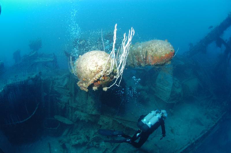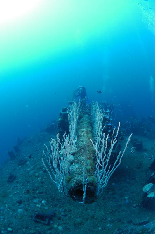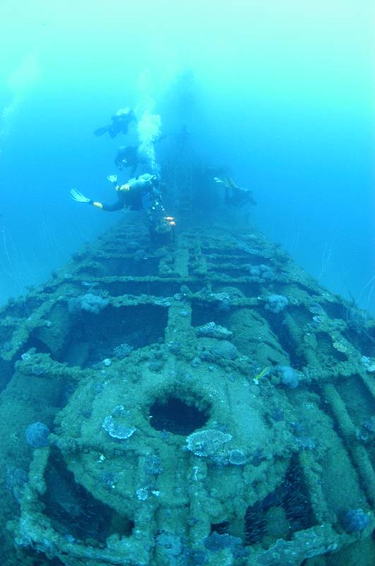 USS APOGON American submarine, 312ft long sitting upright and intact on the bottom. What a great dive. The timber planking is gone from the deck leaving visible the intricate pipe work between the deck and the pressure hull. A starboard torpedo door is open allowing you to see the torpedo loaded in this tube ready to fire. You can put your head into a hole to view inside the torpedo room before swimming back towards the silhouette of the deck gun and conning tower enveloped in sea whips.