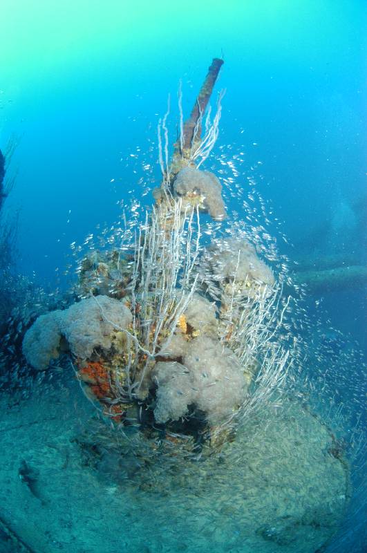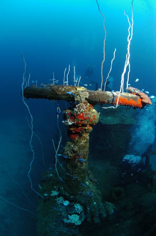 The sides of Sara are almost completely covered with sea whips inhabited by a myriad of fish life. Sharks and eagle rays cruise the flight deck and surrounds and the obligatory school of batfish accompany the divers at the bridge and deco trapeze.