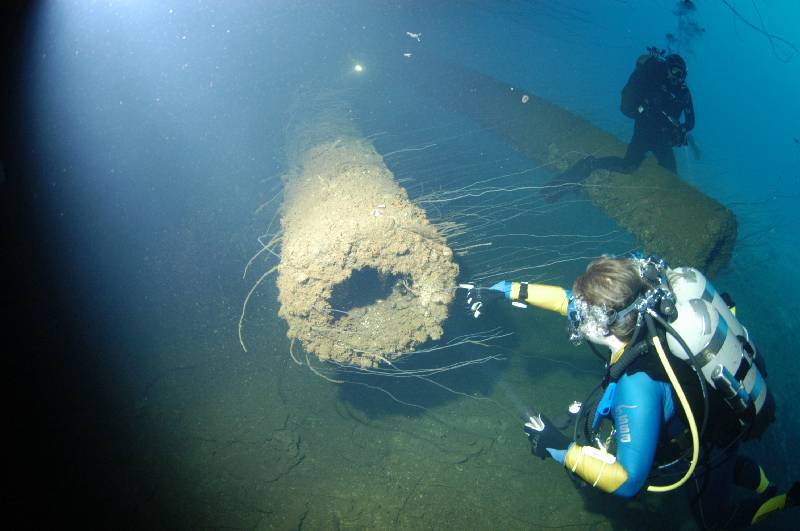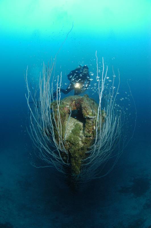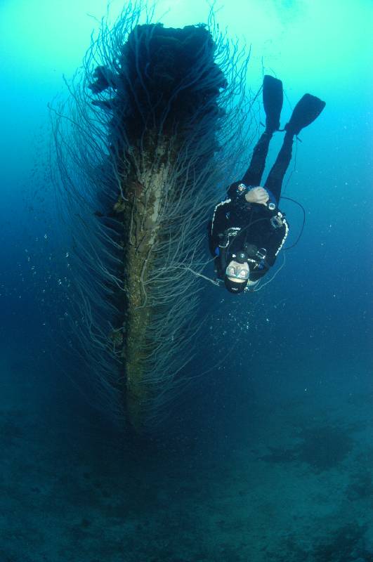 Once past the guns you come to 4 massive anchor chains hanging from the hawsers and disappearing into the sand below. Swimming past the chain and out from under the bow at 55 metres, you turn around settle on the bottom and take time to marvel at the monstrous bow enveloped with sea whips, a memory that will never be forgotten. From here you swim up the bow and along the bottom of the hull, you note the waves in the hull that seem to stretch the length of the ship and they remind me of a crinkle cut potato chip. Then I remember this hull is 27 inches thick!