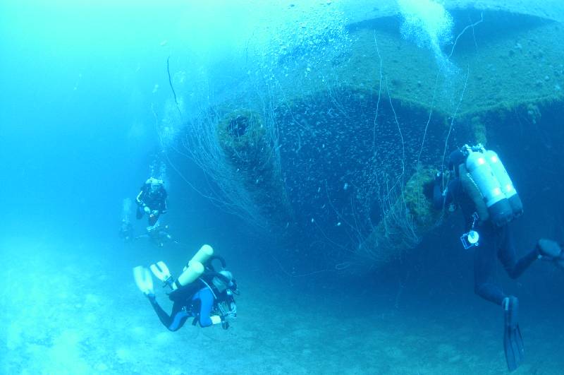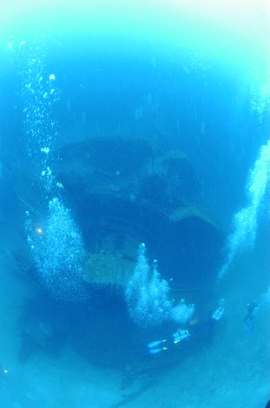 This dive takes you over the forward elevator for a swim along the portside guns, from here it's across the flight deck to the starboard guns forward of the bridge and then into the bridge for some limited penetration. After a stop at 15mts at the top of the bridge, we make our way across to the trapeze suspended from the dive boat.