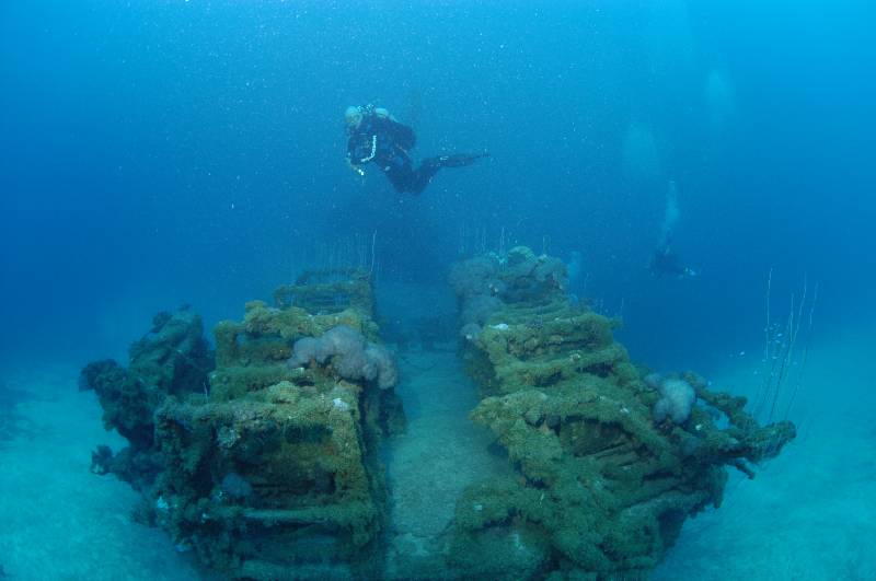 As checkout dives go, this must be the best in the world. At 880 ft long, 39,000 tons the USS Saratoga (or Sara as it is affectionately known) is the largest diveable vessel in the world and the only aircraft carrier available for diving. Sitting upright on the bottom in 55mts and rising to within 15mts of the surface. The flight deck is around 30mts.